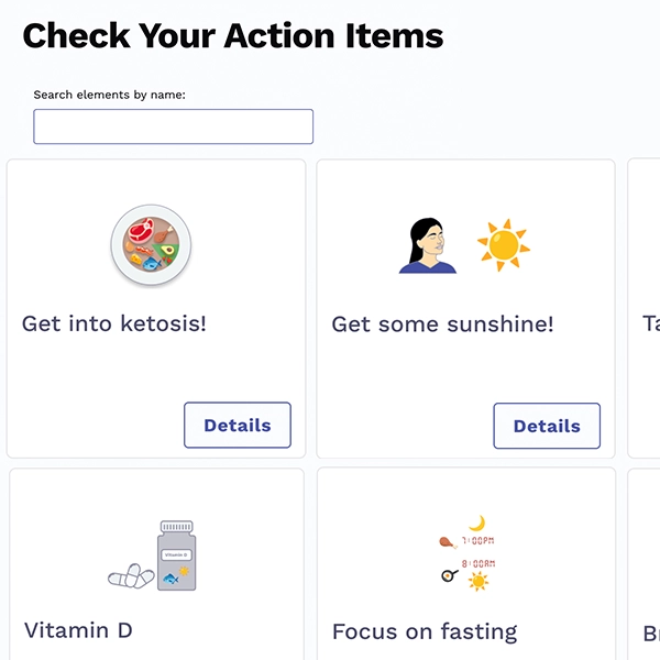 Our knowledge base includes over 100 action items to choose from, like eating a nutrient-rich, anti-inflammatory diet, frequent physical activities, improving sleep hygiene, stress management techniques, or regular sun exposure. All of these lifestyle suggestions are grounded in evidence from cutting-edge medical research and guided by evolutionary science and ancestral health principles.